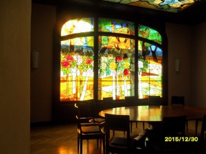 Mozaik üvegek díszítik az ebédlő falát és a bejárat homlokzatát.