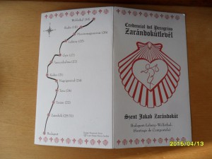 Ez már harmadik zarándokútlevelem. Budapesttől indul és Rajkánál hagyja el az országot. Kijelölt helyeken vannak a szállások, de vannak! 20-30 kilométerenként. Igazából csak Lébényig tart és onnan becsatlakozik az európai Szent-Jakab útba. Egészen Santiago de Compostella-ig. Ha valaki innen indul és gyalog akar menni végig, akkor 2800-3200 km-t kell megtennie.